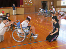 車椅子体験を通して、車椅子の利用者がどのような不自由を感じているのか、どのようにしてもらったら生活しやすいかを学んでいます。