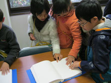 点字図書を実際に触って、目の不自由な人の生活を学んでいます。